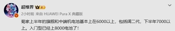 【CNMO科技消息】近日,有数码博主爆料称,华为上半年旗舰机型和中端新机电池容量基本在6000mAh以上,包括即将发布的Pura X2;而下半年新机则基本在7000mAh以上。爆料还指出,入门级的畅享90系列已经上8000mAh级电池。